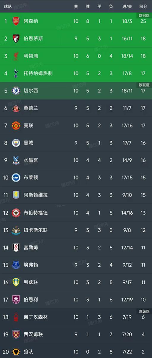 北京时间11月2日,英超联赛第十轮七场比赛结束。最新排名如下!阿森纳继续保持出色的表现,在上届英超联赛积分榜上名列前茅。他们客场2-0击败伯恩利,取得英超五连胜。 Jekelesh 先生和 Rice 先生也做出了贡献。枪手目前8胜1平1负积25分,领先排名第二或更低的对手7分。总体效益是比较明显的。枪手上一次夺得英超冠军是在2003-04赛季。在过去的三个赛季中,他们都获得了第二名,输给了曼城或利物浦。本赛季,利物浦和曼城的实力都有所下滑。枪手现在建立了较大的领先优势,掌控了冠军争夺战。枪手取得领先,利物浦终于止住颓势。他们主场2-0击败阿斯顿维拉,结束英超联赛球队连败四分。萨拉赫和赫拉芬贝夫在上半场和下半场各进一球。这场胜利对于红军来说非常重要。他们取得了本赛季的第六场胜利,并以18分重返第三位。同时我们也增强了信心,准备好第四场欧洲比赛主场迎战皇马。红军结束连败遭遇赛季第三场失利,而阿斯顿维拉则以4胜3平3负积15分升至第11位。热刺与切尔西面临着强强对决。佩德罗打进唯一进球。目前两队5胜2平3负积17分。托特纳姆热刺暂时排名第四,蓝军排名第五。曼联作为客队对阵诺丁汉森林。红魔处于劣势,深陷降级区,但他们过得并不轻松,首节依靠卡塞米罗的头球破门t 一半。下半场红魔刚刚逆转,打破三连胜。红魔注意力不集中,防守失误,导致开场两分钟就丢了两球。吉布斯-怀特和萨沃纳决定超车。第81分钟,迪亚洛中距离射门解围。最终,两队互交分,比分2-2握手言和。红魔3连胜结束,目前积17分排名第7。诺丁汉森林积六分排名倒数第二。不过,他们目前仍处于降级区。布莱顿3-0击败利兹联,终结拉查两连败,积15分升至第十位。富勒姆以3-0击败排名垫底的狼队。后者仍在争冠,保级难!